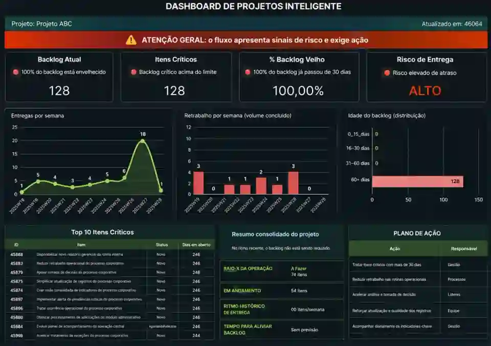 O Dashboard de Projetos Inteligentes é uma estrutura prática para transformar dados do projeto em visibilidade real, leitura executiva e plano de ação com apoio de IA.